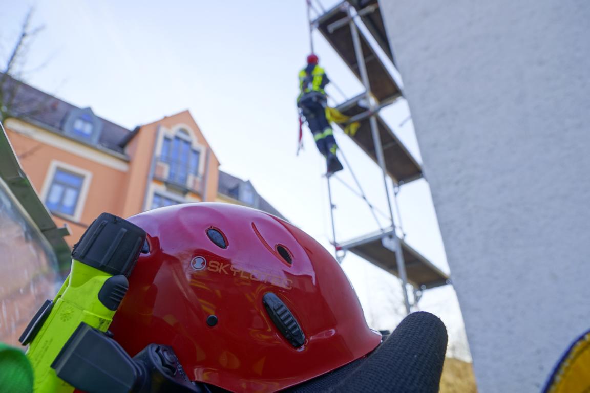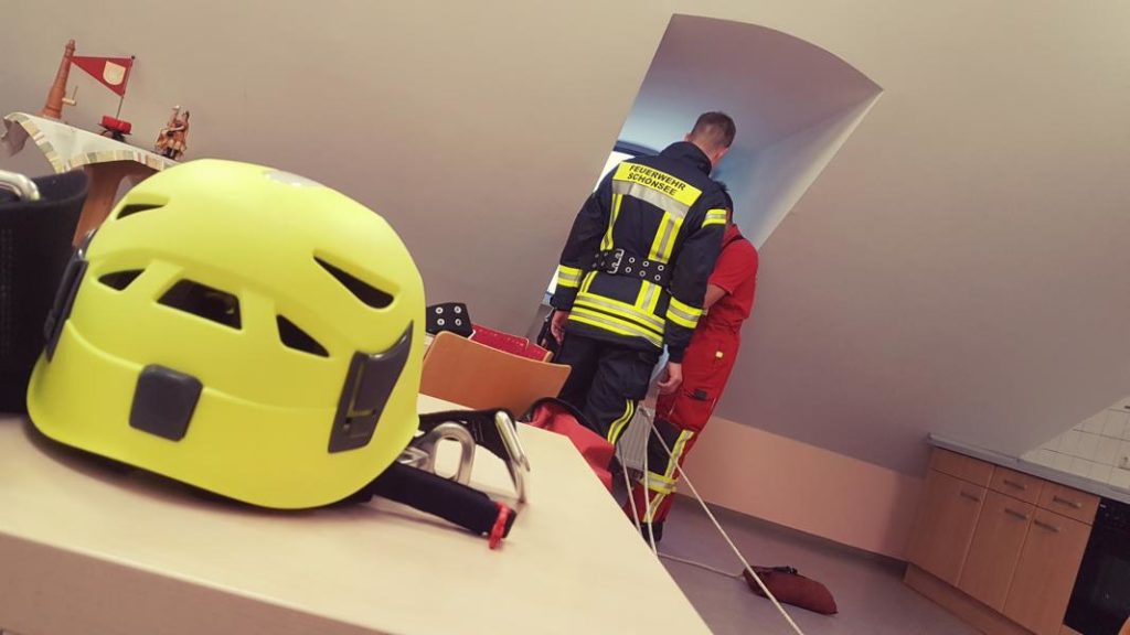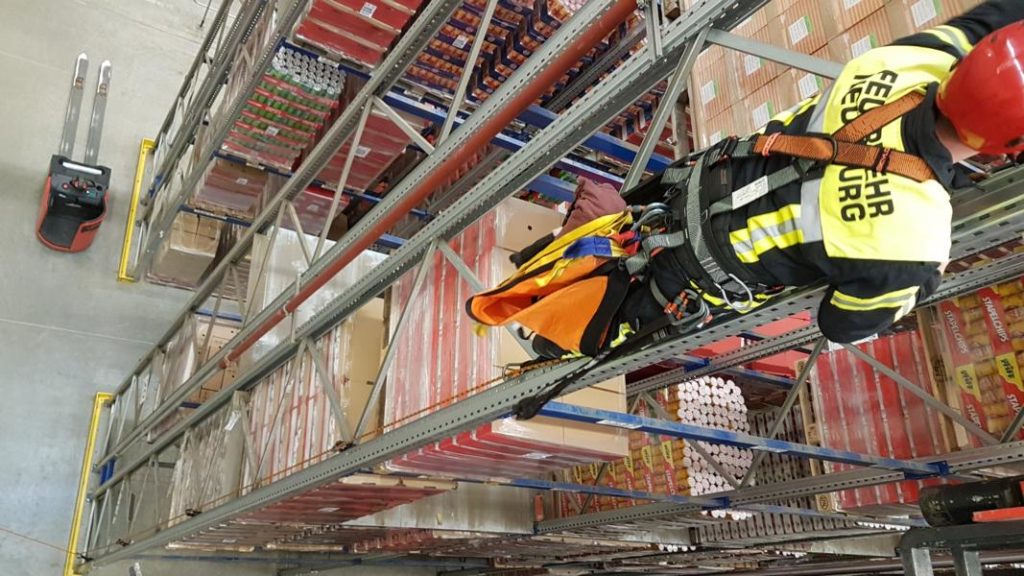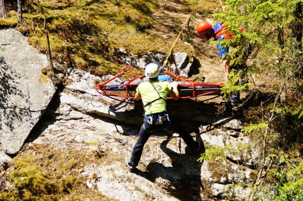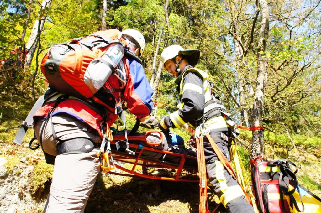 Übung: Einsatz mit der Schleifkorbtrage um verletzte Personen wieder sicher auf den Boden zu bringen.